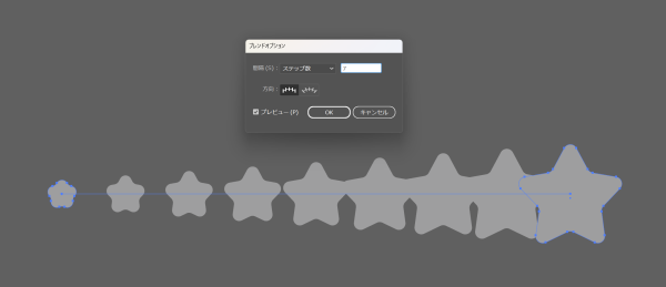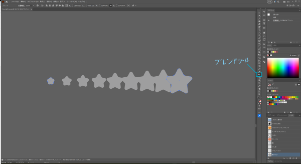 2.星を二つにして大・小両方用意する。ブレンドツールを選択し、二つの星を選択