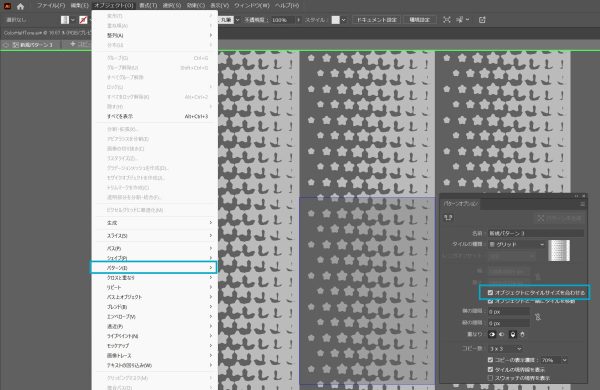 【オブジェクト/パターン/作成】を行い、オプションの【オブジェクトにタイルサイズを合わせる】でパターン化が出来ます!