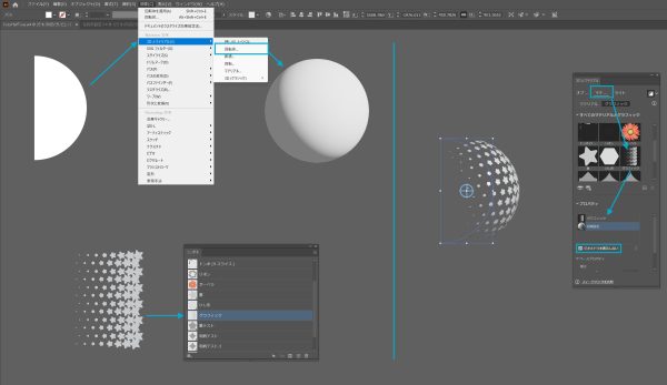 2.半円の図形を作成→【効果/3Dとマテリアル/回転体】で立体的な球体を作成