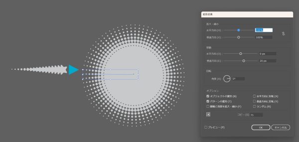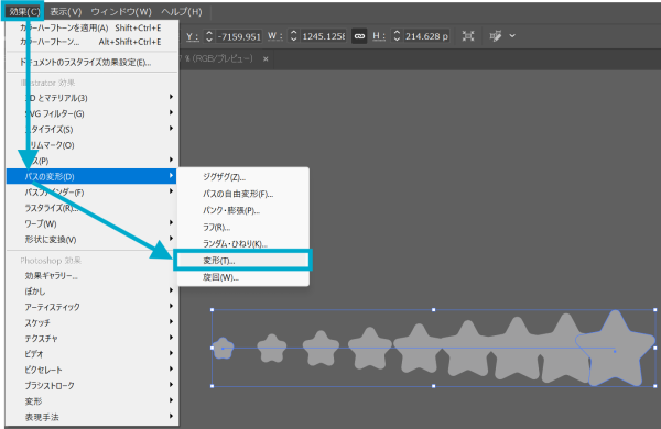 2.【効果/パスの変形/変形】から回転の値を調整する