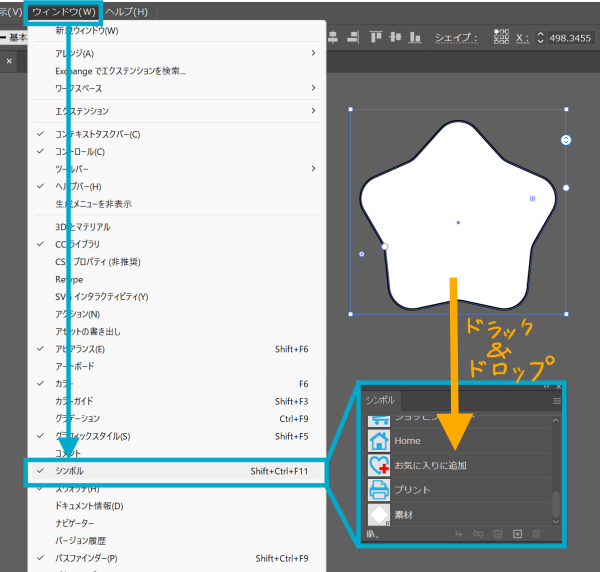 【ウィンドウ/シンボル】でシンボルのウィンドウを出して、そこに素材をドラック&ドロップ